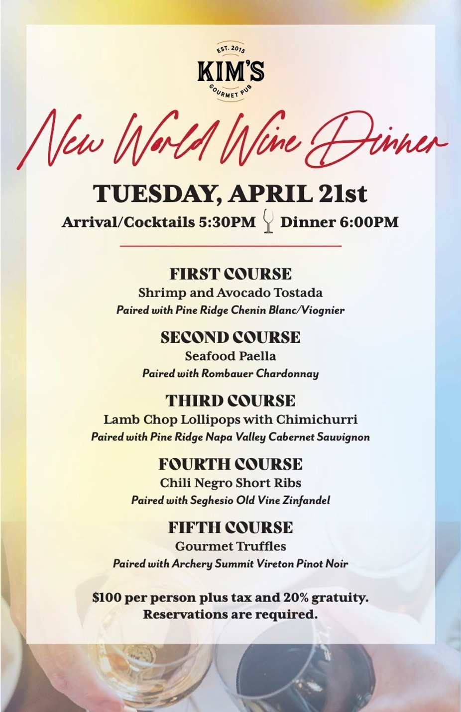 5:30pm-8pmNew World Wine DinnerTuesday, April 21st, 2026